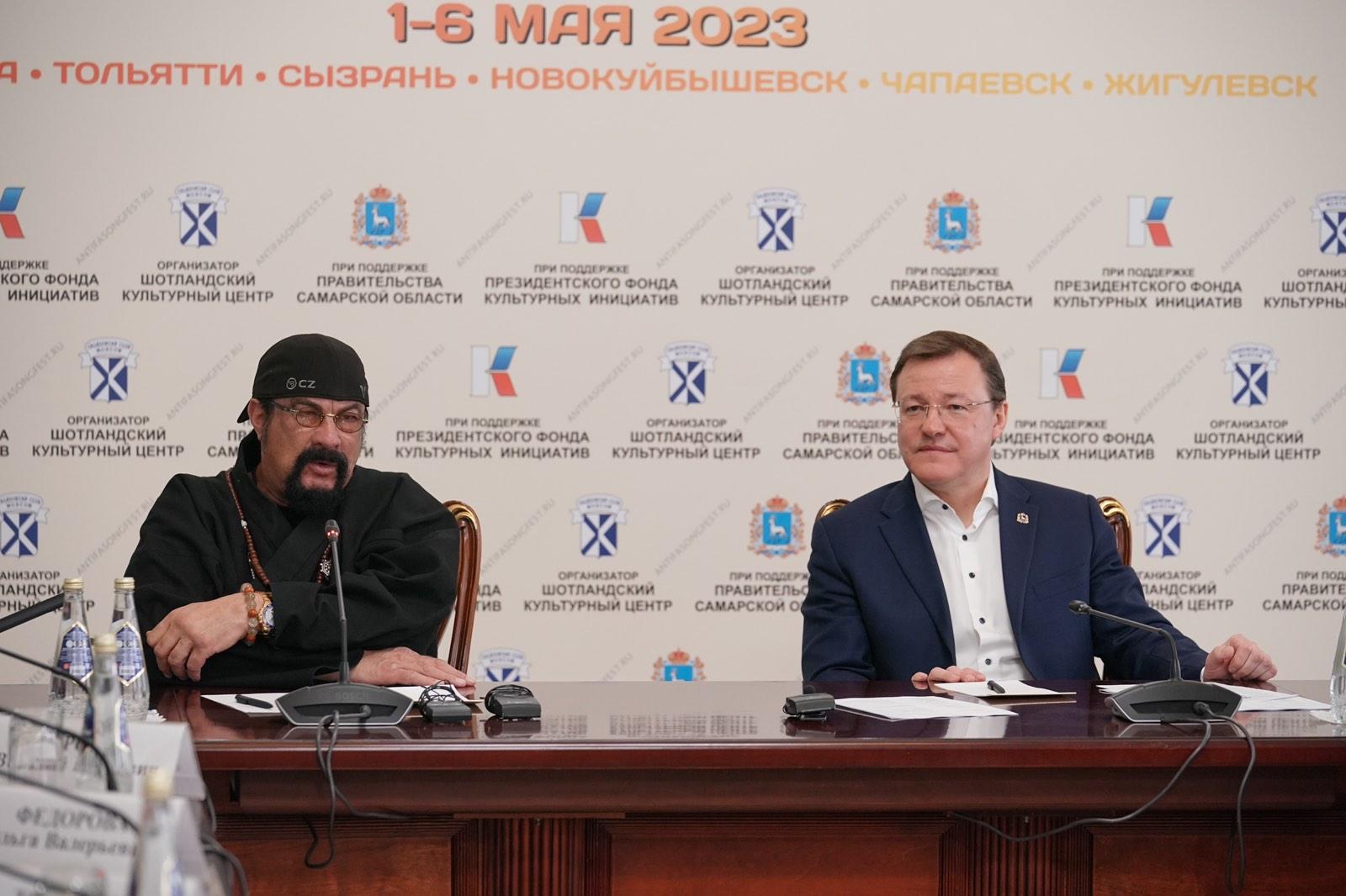 Сегодня, 6 мая, в Самаре состоялась совместная пресс-конференция губернатора Самарской области Дмитрия Азарова и почетного гостя Международного фестиваля антифашисткой песни «Гитары в строю!», актера и музыканта, мастера боевых искусств Стивена Сигала.